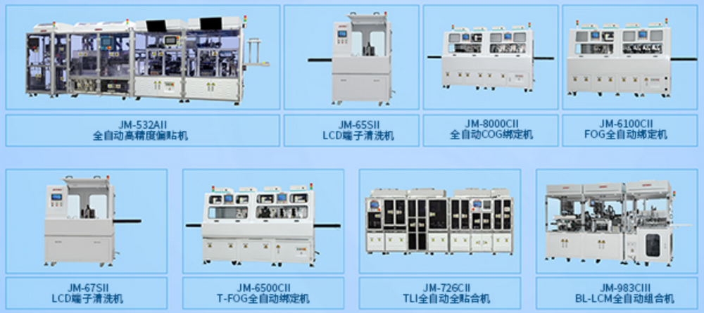 公司的主要產(chǎn)品包括有:COG全自動綁定機(jī)、FOG全自動綁定機(jī)、T-FOG全自動綁定機(jī)、TLI全自動全貼合機(jī)、BL-LCM全自動組裝機(jī)、背光源全自動疊片機(jī)、CCM全自動綁定機(jī)、3D貼膜機(jī)、脈沖式熱壓機(jī)等系列設(shè)備。