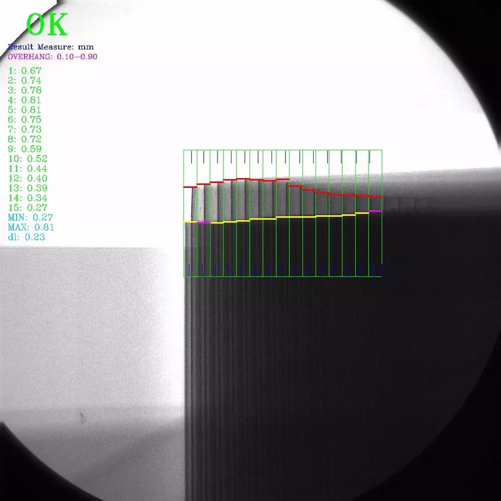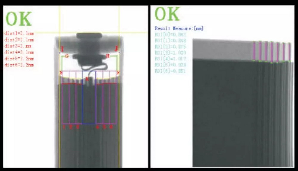 ▲鋁殼電池頭部極耳內(nèi)部結(jié)構(gòu)和正負(fù)極片對(duì)齊度檢測(cè)