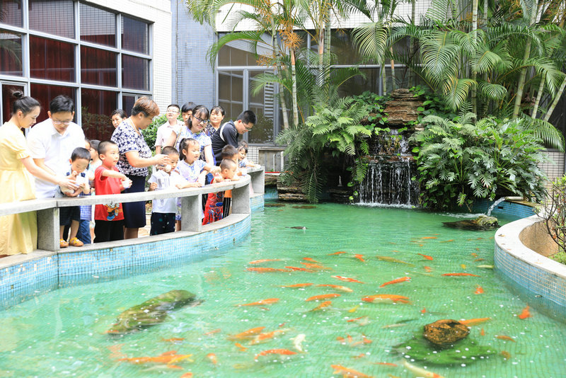黃的、白的、黑的魚兒在水里游來游去,時(shí)不時(shí)悄悄冒出水面吐一個(gè)夢幻般的空氣泡…..在參觀公司時(shí),小朋友們來到了魚池邊,看到魚兒可興奮極了,并在爸爸媽媽的指導(dǎo)下給魚兒投食。