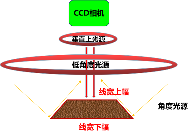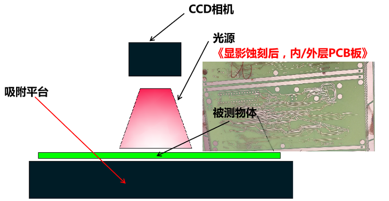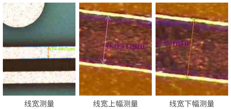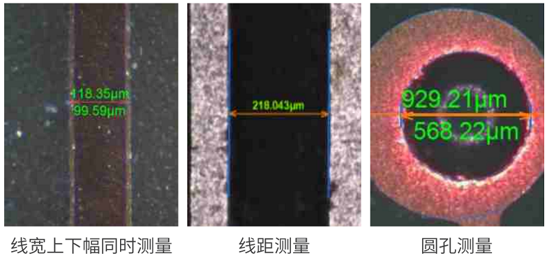 通過影像成像系統(tǒng)及光源從上表面垂直于被測板,呈顯影像(相機實時拍圖)感測,并將圖像傳送至電腦測量軟件,通過軟件測量工具分析圖像的“線寬/線距/線寬上下幅/圓/金手指線寬等”標準公差值對比,從而判斷被測板上的測量值OK或NG。