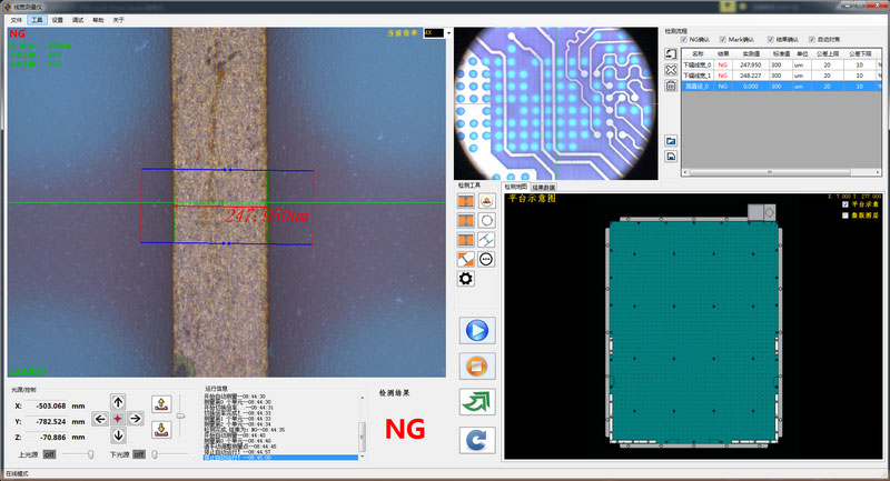 編程后量產測量速度快,平均測量≤3S/點,快速測量“線寬/線距/線寬上下幅/圓/金手指線寬等”,分析標準公差值對比,從而智能判斷被測板上的測量值OK或NG。