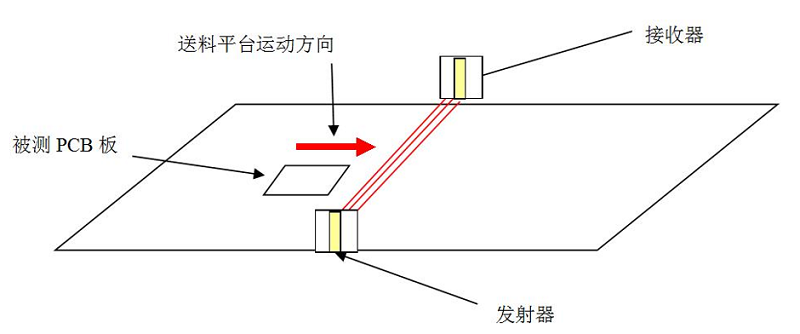 利用非接觸式影像測(cè)量技術(shù),通過一對(duì)高精度激光位移傳感器,包括一個(gè)接收裝置和一個(gè)發(fā)射裝置,當(dāng)覆銅板或PCB板經(jīng)過這對(duì)位移傳感器時(shí),有板的地方將會(huì)阻擋發(fā)射裝置發(fā)射的信號(hào),從而在接收裝置上無法響應(yīng)相應(yīng)位置的信號(hào)。