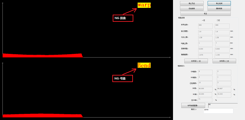 通過位置的信息可以得到PCB板的板厚曲線圖,通過特定軟件算法和翹曲度定義,計(jì)算出板翹曲度,并根據(jù)設(shè)定判斷條件得出OK和NG板。