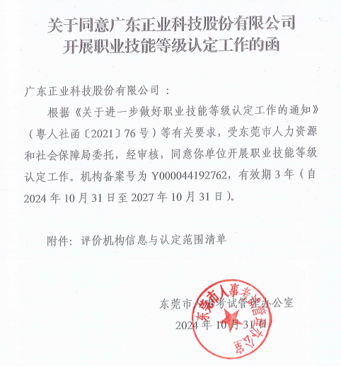 近日,廣東正業(yè)科技股份有限公司(以下簡稱:正業(yè)科技)收到了東莞市人事考試管理辦公室“關(guān)于同意廣東正業(yè)科技股份有限公司開展職業(yè)技能等級認(rèn)定工作的函”。這標(biāo)志著公司順利完成了職業(yè)技能等級認(rèn)定備案工作,開啟了公司技能人才隊伍培養(yǎng)與認(rèn)定的新篇章。