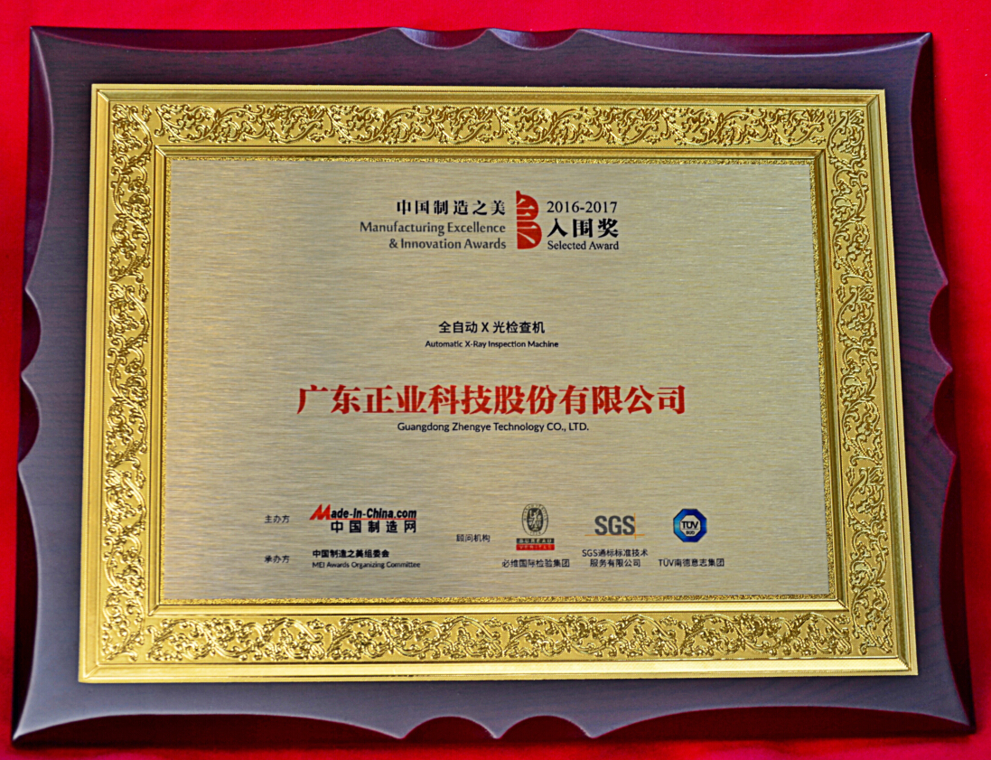 2016年12月,廣東正業科技股份有限公司的新產品全自動X光檢查機,獲得獲得由中國制造之美與SGS、BV、TUV南德三大國際知名認證機構聯合頒發的榮譽獎牌——中國制造之美入圍獎。該獎項主要獎勵具有創新精神、具備行業領先技術水平的新產品和新技術。